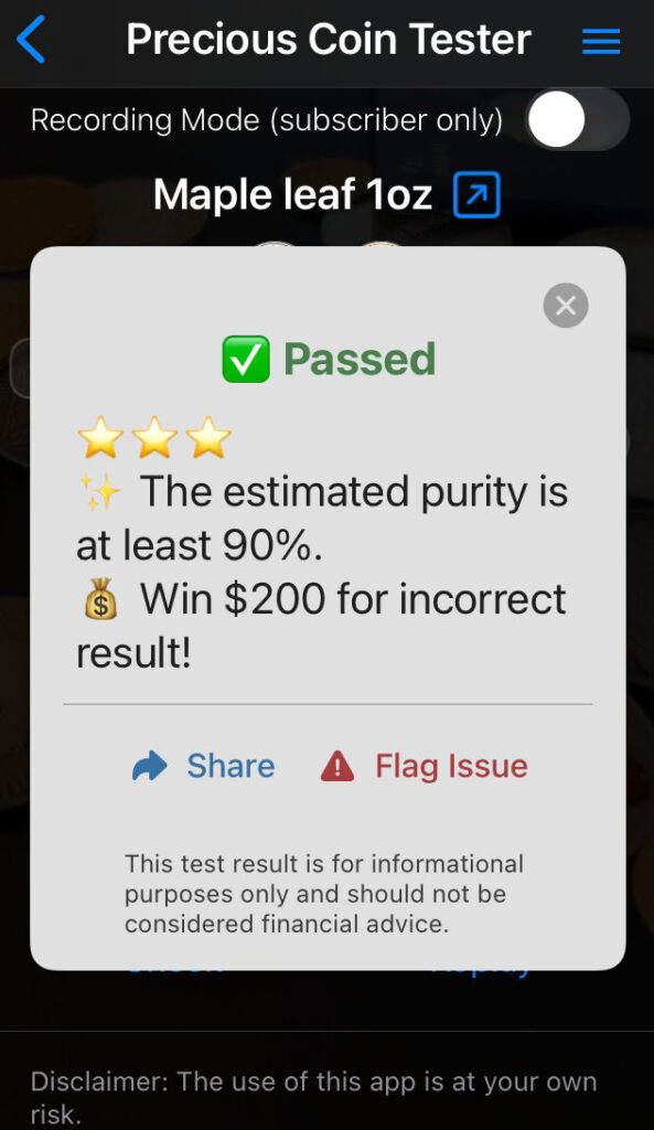 Przyznam, że Precious Coin Tester (link do aplikacji w App Store) jest rozbudowany i ma sporą bazę monet. Chwilę zajęło mi znalezienie właściwej pozycji (Maple Leaf), ale potem poszło już sprawnie.